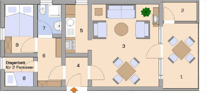 Der großzügige Wohn- und Essbereich zum Wohlfühlen geht im "amerikanischen Stil" direkt in die komplett ausgestattete Küche über. Von einem Flur gehen ein helles Bad mit WC und Dusche sowie die 2 getrennten Schlafzimmer mit insgesamt 4 Schlafplätzen ab. Das erste Schlafzimmer ist mit einem Doppelbett ausgestattet, ein Kinderbett kann zugestellt werden. Im zweiten Schlafzimmer befindet sich ein Etagenbett. Genügend Stauraum für Kleidung und Ausstattung findet sich im großen Wandschrank im Flur.